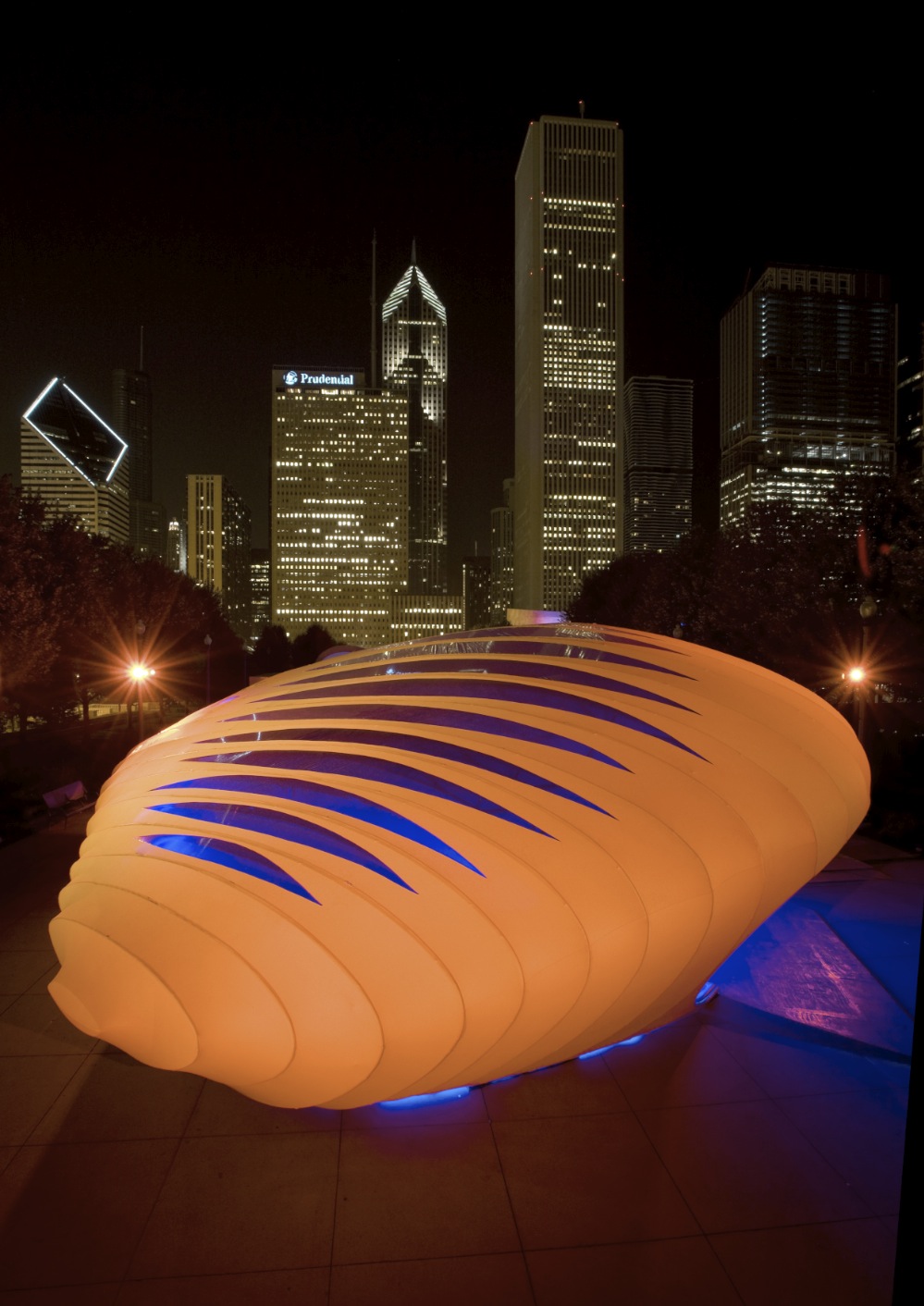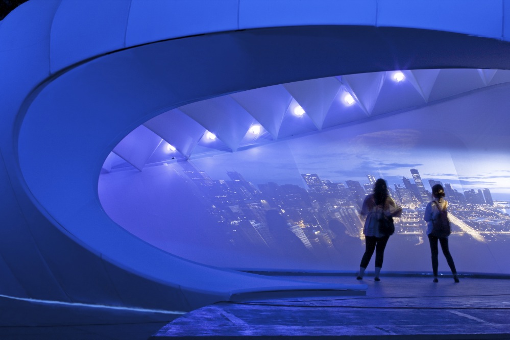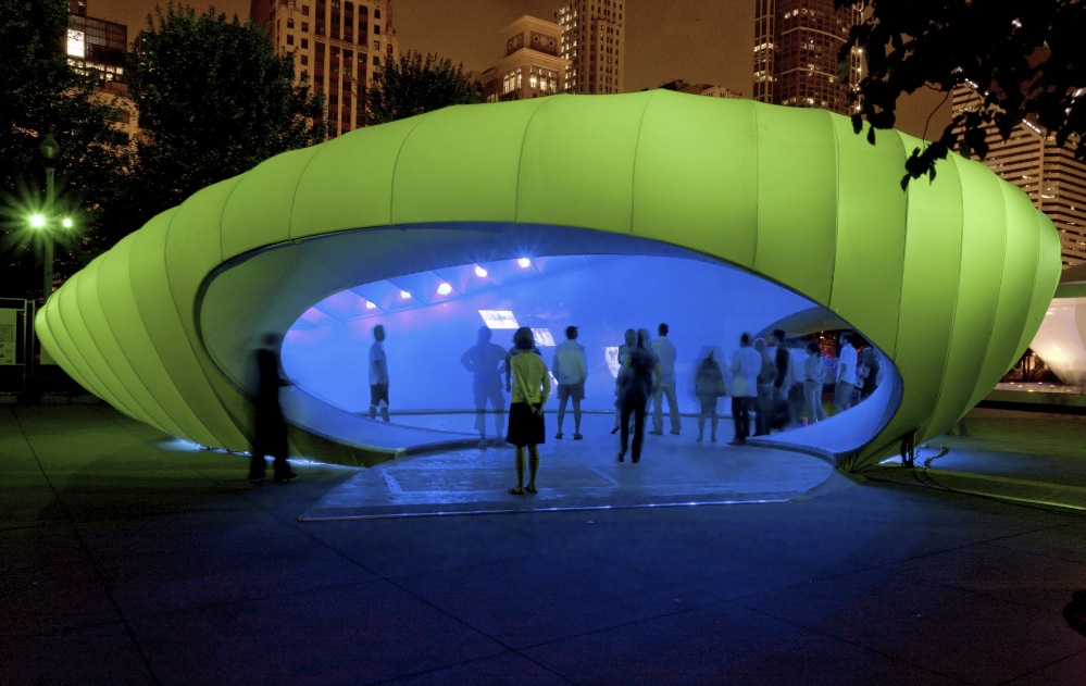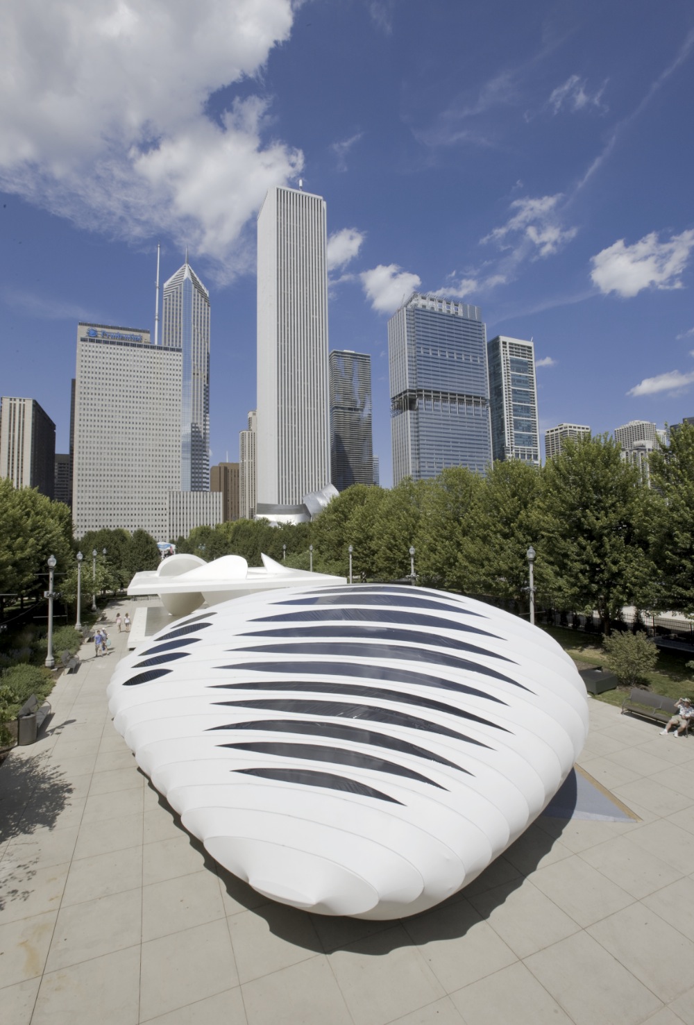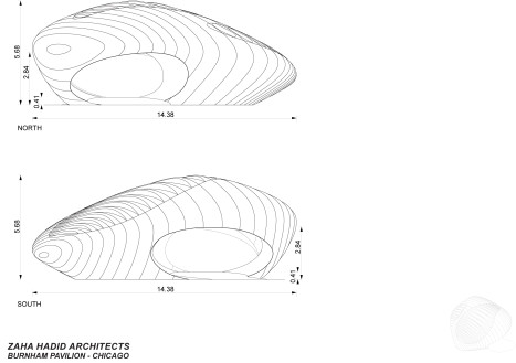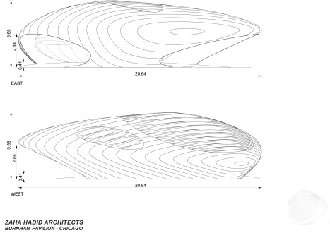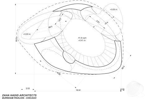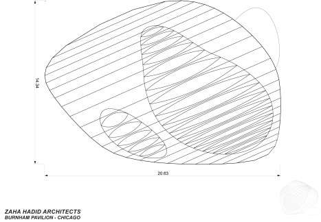 Zaha Hadid Architects: el pabellón fusiona nuevos conceptos formales con la memoria de la planificación audaz de Burnham. Superposiciones de estructuras espaciales con rastros ocultos del Plan de Burnham se sobreponen y se inscribe dentro de la estructura para crear una forma dinámica.